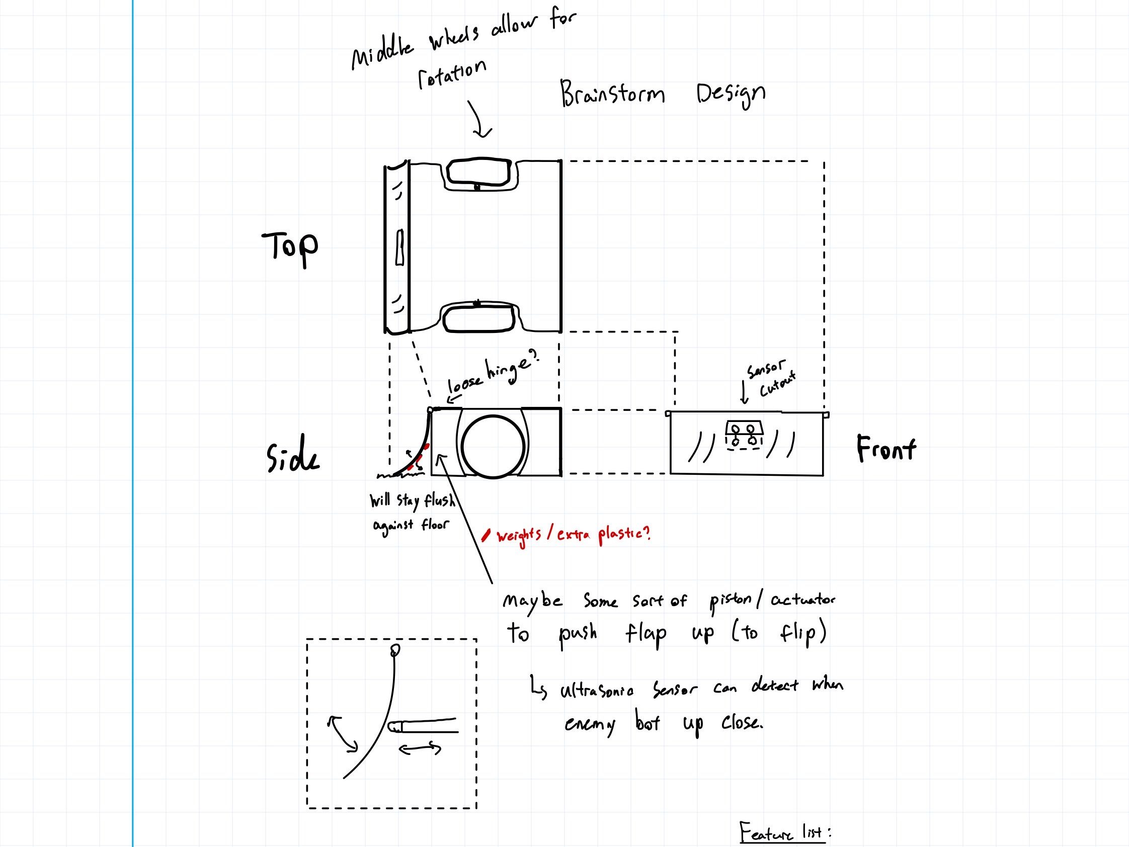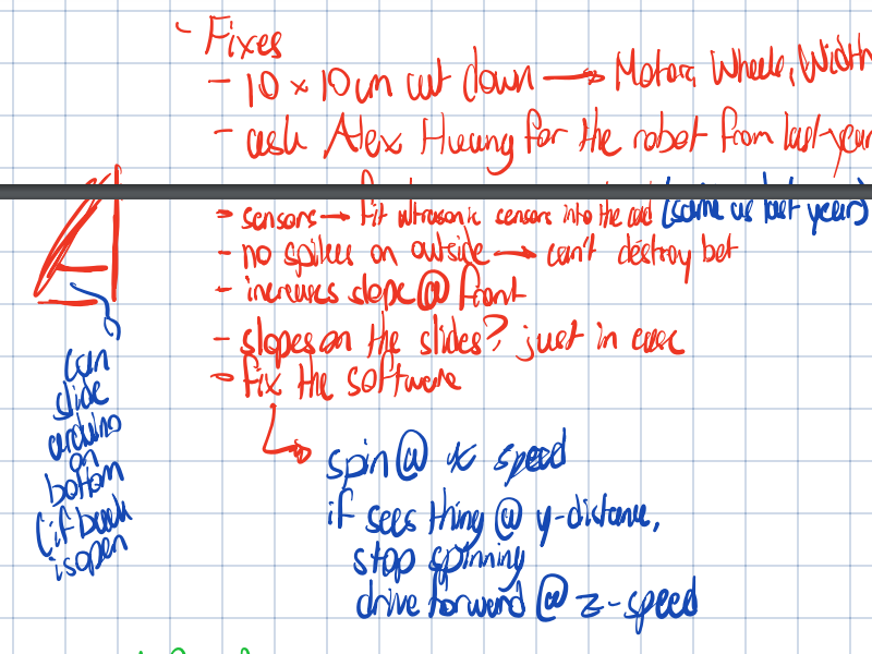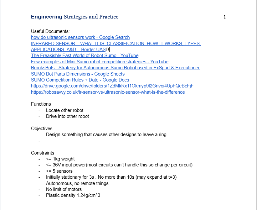 The first thing our team did was research. This included looking at professional SUMO matches to see what strategies different teams used, carefully analyzing the rules and constraints for our robot, and looking at Fusion360 tutorials to make CADing the SUMO robot easier. This allowed us to create some specifications for our robot.