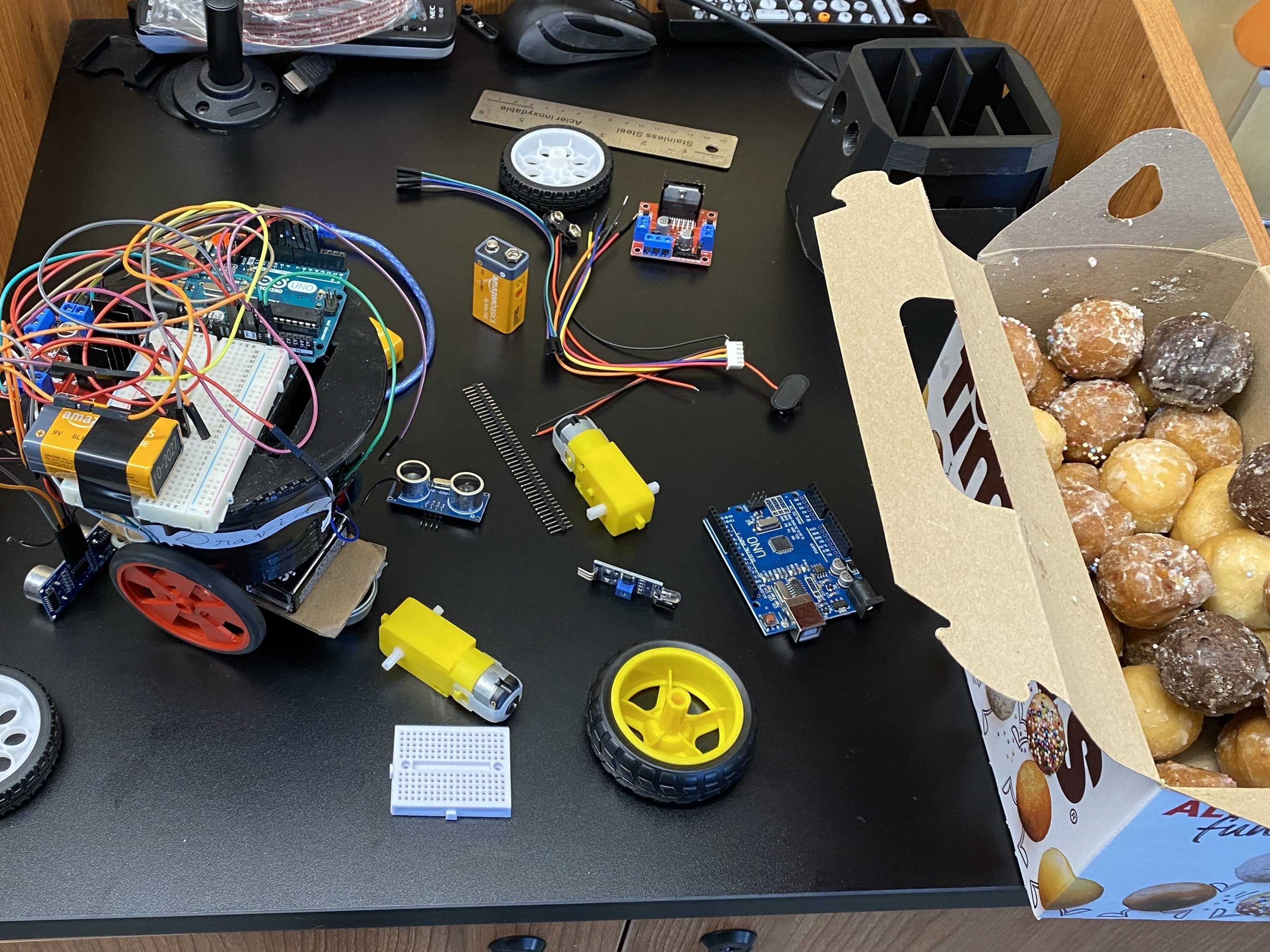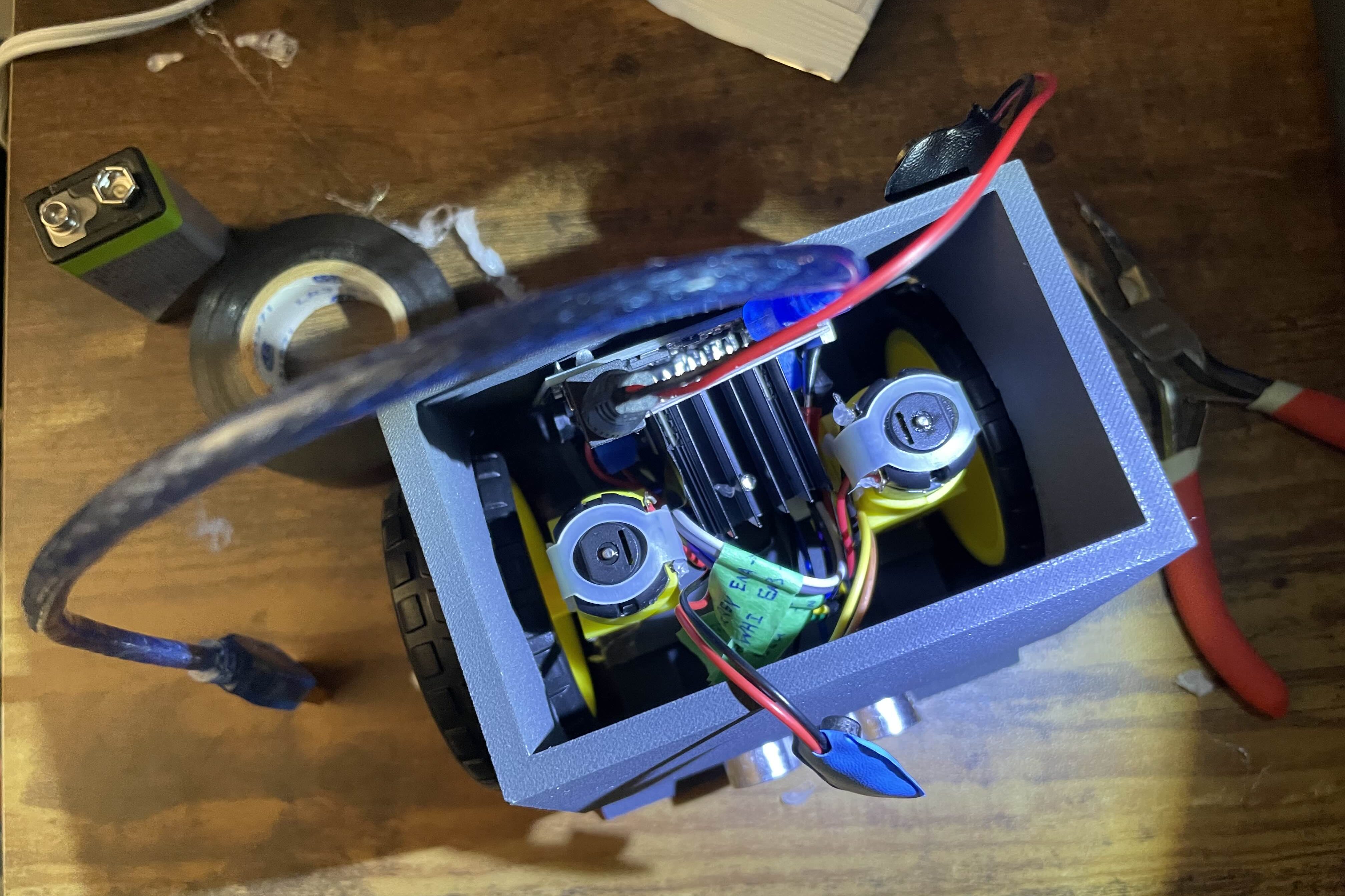 Once we CADed the robot in Fusion360 and Brendan 3D printed the robot at the MyFab facility, we instantly ran into a couple issues. First of all, I may or may not have forgotten to add eye holes for the robot. Another issue that we faced is that we had to solder the motors SO many times because the wires snapped off so many times. Finally, we were having a lot of difficulties with getting the code to run consistently because there was a lot of variance between tests. Even if we did not change anything in the code, the robot would perform different. But it was alright, as we had a finished robot the day before the competition!